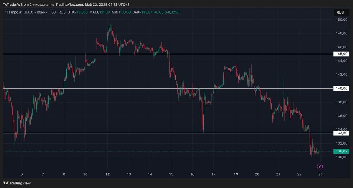 🧠 Вчера индекс закрылся определенно шортово, под 2800. Но, так как на вечерней торговой сессии пошло падение, на продолжение падения Я бы не ставил. Работал в шорт только от задерга, от сопротивлений. Например: $GAZP Планирую присмотреть шорт на отскок от 133,5. (Вход могу взять в диапазоне 133 - 133,5) ❗️ Стоп поставлю 0,5%. Тейк +1-1,5% При достижении +0,5% поставлю стоп в без убыток. Желательно, чтобы акция пришла первичным движением к уровню сопротивления! НЕ призыв к действию! Больше идей в Базе. ВНИМАНИЕ!!! Это условия торговли, то есть ЕСЛИ Газпром придет к уровню, зайду. НЕ придет, НЕ зайду!!! Могут выйти новости, это остается доп риском и это НЕВОЗМОЖНО спрогнозировать! Идея актуальна ТОЛЬКО, пока минимум дня ВЫШЕ 130,1! Всем прибыльной пятницы! 🤝