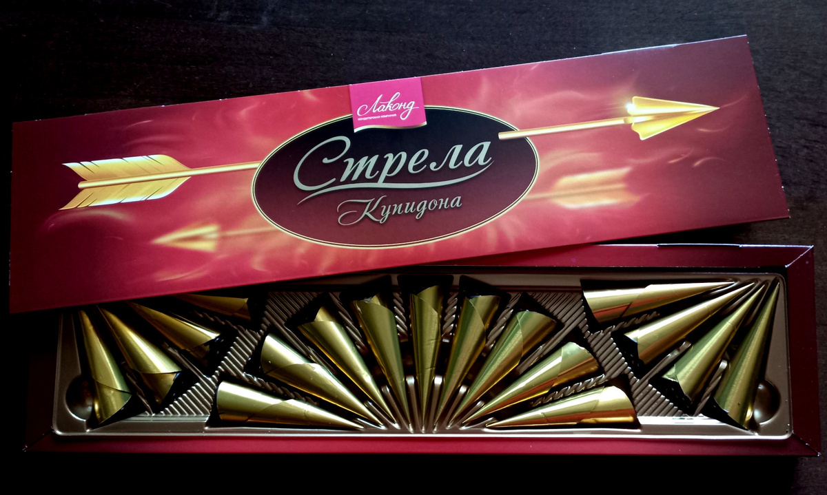 Все жители Донецка с детства помнят вкус конфет «Стрела». Донецкая кондитерская фабрика начала производить конфеты «Стрела» еще во времена СССР и конфеты сразу понравились жителям Донбасса. Конфеты завернуты в блестящую «золотую» фольгу в форме конуса и по задумке дизайнеров, должны напоминать наконечник стрелы. В настоящее время производитель конфет «Лаконд», соблюдая патентные требования (видимо имя «Стрела» уже «застолбила» за собой другая фабрика) назвал конфеты «Стрела купидона». Но все называют их по старой памяти просто стрела. Внутри конуса из темного шоколада мягкая начинка со вкусом коньяка. Для своей ценовой категории конфеты качественные и вкусные. А вот на сколько по вкусу они похожи на те легендарные советские мнения разделились. Кто-то говорит, что это вкус детства, а кто-то утверждает, что те прежние были намного лучше. Но я думаю, этот спор некорректен. Сравнивать вкус конфеты, которую съел сегодня и вкус, который остался только в воспоминаниях (а прошли уже десятки ле
