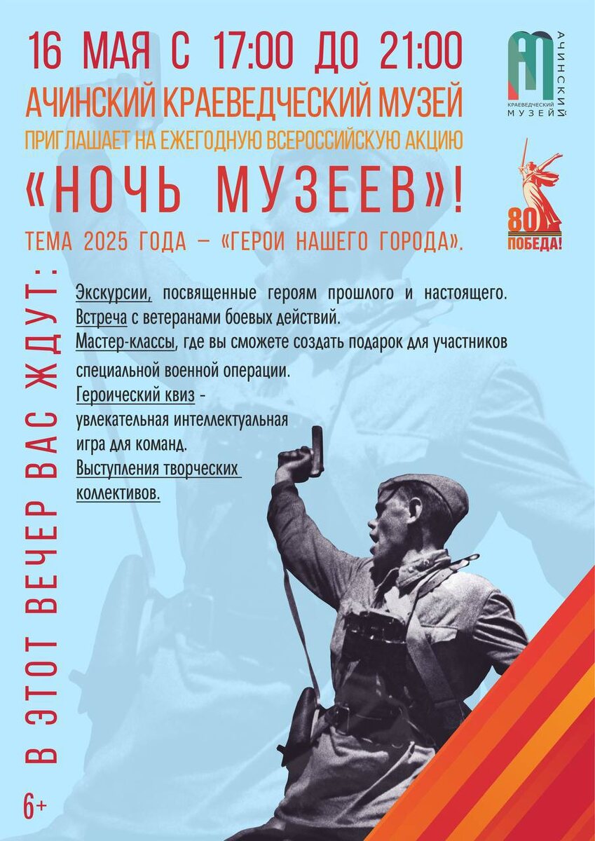 Уважаемые посетители! Напоминаем что сегодня у нас проходит всероссийская акция «Ночь музеев»! Программа вечера: 🌟Экскурсии, посвященные героям прошлого и настоящего; 🌟Встреча с ветеранами боевых действий; 🌟Мастер-классы, где вы сможете создать подарок для участников специальной военной операции; 🌟Выступления творческих коллективов; 🌟Героический квиз - увлекательная интеллектуальная игра для команд. Мы открыты для Вас с 17.00 до 21.00 ч.