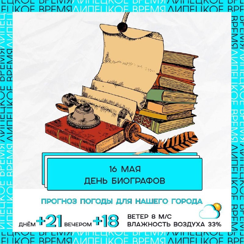 👥 Сегодня, 16 мая, отмечается День биографа — праздник, посвящённый тем, кто сохраняет для нас истории жизни выдающихся людей. Дата выбрана не случайно: 16 мая 1763 года состоялась первая встреча Сэмюэля Джонсона и его будущего биографа Джеймса Босуэлла, положившая начало жанру современной биографии. 🔎 Интересный факт: Михаил Булгаков, родившийся 15 мая 1891 года, праздновал свой день рождения 16 мая. Он свободно говорил на четырёх иностранных языках и в 7 лет написал свой первый рассказ. 🌤 А ещё сегодня в Липецке ожидается переменная облачность без осадков. Днём температура воздуха поднимется до +19 °C, ночью опустится до +8 °C. Ветер южный, 5,4 м/с. Атмосферное давление составит 746 мм рт. ст.