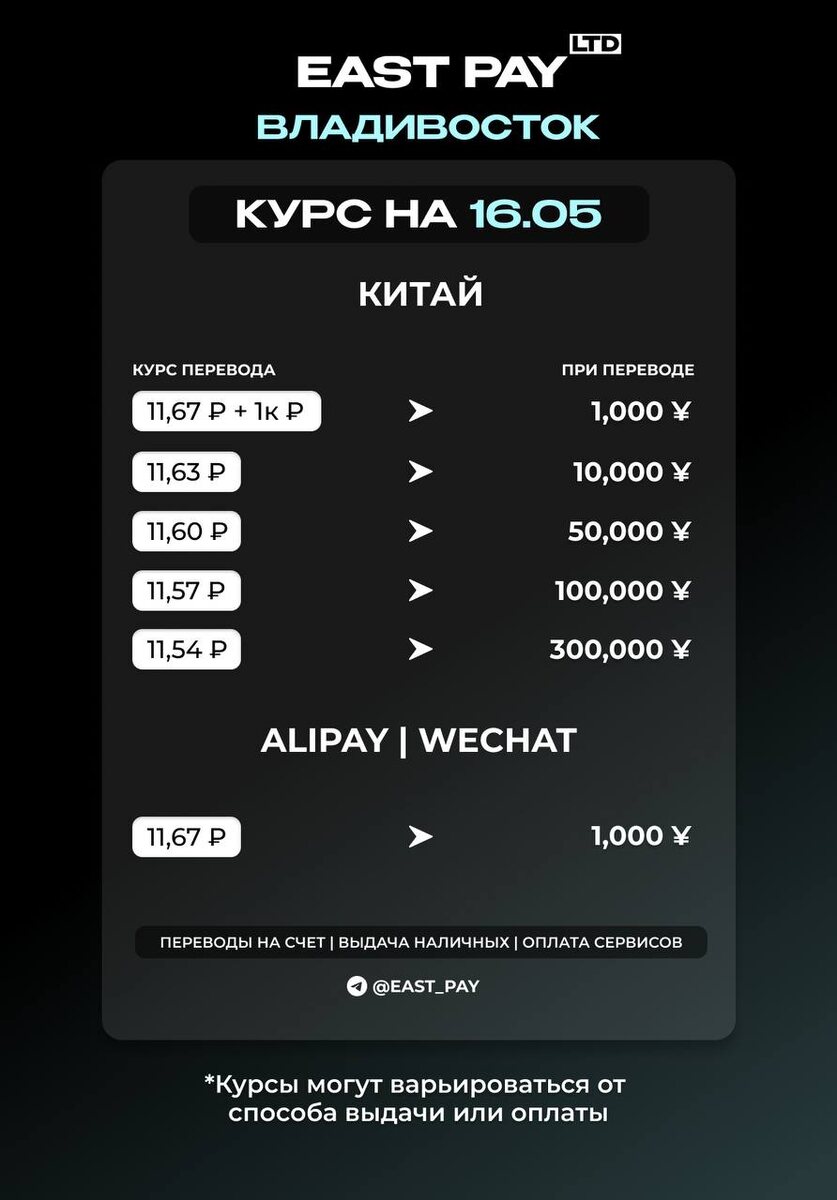 КУРСЫ НА КИТАЙ 💙Переводы на китайскую карту 💙Alipay / Wechat 🔘В течение дня курс может меняться. Рекомендуем уточнять актуальный курс у менеджера. ❗️ВАЖНО: мы получили лицензию и открыли офис в Корее. Подробности можете узнать у менеджера. 🔴🔴🔴🔴🔴🔴🔴🔴🔴🔴 🟠Написать менеджеру: @east_pay_world 🟠Сделать просчет самостоятельно в боте: @East_PaySer_bot ✈️ Подписаться на «East Pay»