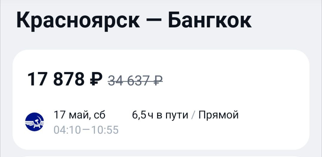 Как сгонять в Бангкок за 38000₽ ↔️ с багажом? Берём билет на завтра за 17800₽ ➡️ 👆 https://aviasales.tp.st/TPcJ91kn И самое главное! У "Аэрофлота" сейчас проходит мильная акция "Туда, где уже лето" - покупка билетов на сайте авиакомпании за деньги + 1000 миль. Но, оказывается, из лета тоже можно вернуться по весьма приятной цене)). Бангкок/Пхукет - Красноярск - 20169₽ + 1000 миль. Билеты с багажом! И только на сайте перевозчика. Обязательно ставьте галочку "за мили". Сказать админу спасибо ❤️ #BKK @KJA