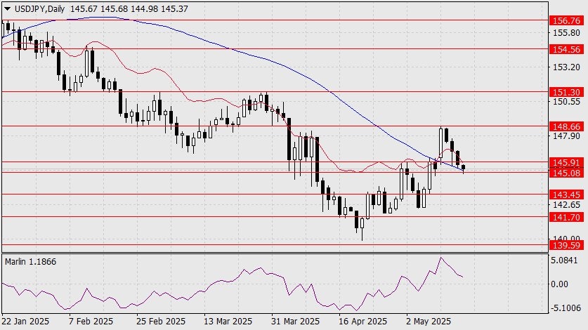 https://basechop.ru/wordpress/?p=42906 USD/JPY Пятничный день может стать четвёртым подряд дневной чёрной свечкой. Последний раз такой паттерн был в период 3-6 февраля. Но в тот раз, как и в предшествующие 2 раза, когда встречался такой паттерн, происходила минимум коррекция в 1-2 дня. Вот и сейчас цена находится в диапазоне 145.08/91, располагаясь на линии Крузенштерна. Осциллятор Марлин ещё не вышел из зоны роста, поэтому, даже если цена не выйдет из диапазона вверх, то и преодолеть линию Крузенштерна может не сегодня и даже не в понедельник. Но также консолидация может произойти и после закрепления цены под линией Крузенштерна. В этом случае понижающийся паттерн из чёрных свечей увеличится до 5-ти. И здесь может произойти событие, подобное снижению 22 июля-5 августа 2024 года. Подобное не по динамике, но по структуре. Остаётся ждать развития событий. Основной сценарий понижающийся. На четырёхчасовом графике цена закрепилась под линией баланса, но ещё не под уровнем 145.08. Марлин…