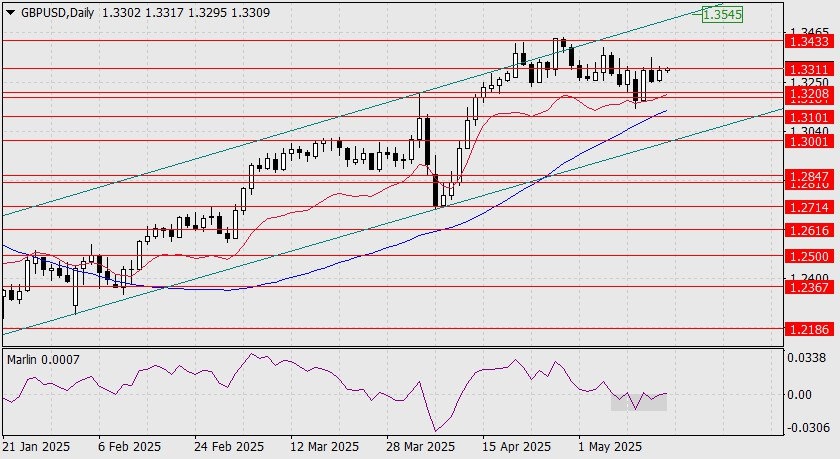 Возможно, фунт подрос бы и выше, но ему помешало техническое сопротивление 1.3311, которое он пытается преодолеть сегодня уже в азиатскую сессию. Фигура «Голова и плечи» по осциллятору Марлин сформирована окончательно. Сигнальная линия осциллятора переместилась на положительную территорию. Ждём дальнейший рост осциллятора и цены к ближайшей цели 1.3433. Далее откроется цель 1.3545 – верхняя граница ценового канала.
