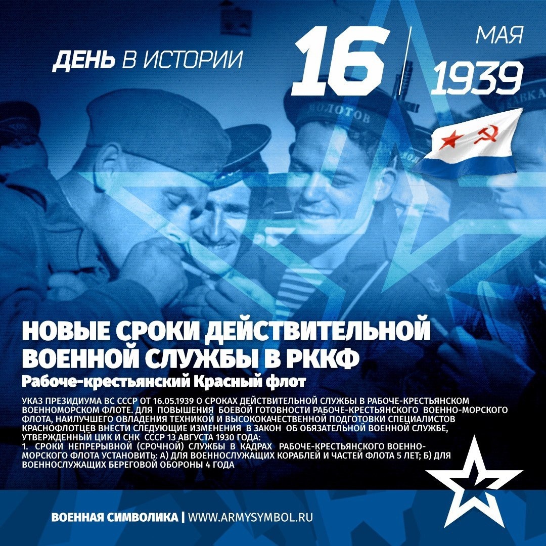 Новые сроки службы в РККФ в 1939 Рабоче-крестьянский красный флот Для повышения боевой готовности Рабоче-Крестьянского Военно-Морского Флота, наилучшего овладения техникой и высококачественной подготовки специалистов краснофлотцев внести следующие изменения в Закон об обязательной военной службе, утвержденный ЦИК и СНК СССР 13 августа 1930 года: 1. Сроки непрерывной (срочной) службы в кадрах Рабоче-Крестьянского Военно-Морского Флота установить: а) для военнослужащих кораблей и частей флота 5 лет; б) для военнослужащих береговой обороны 4 года #ПамятныеДатыВоеннойИсторииОтечества #ДеньВИстории #ГодЗащитникаОтечества #80ЛетВеликойПобеды Источник: https://vk.com/wall-60767131_30654 Подпишитесь на наши группы ВКонтакте и в Одноклассниках - читайте, смотрите и комментируйте! Источник
