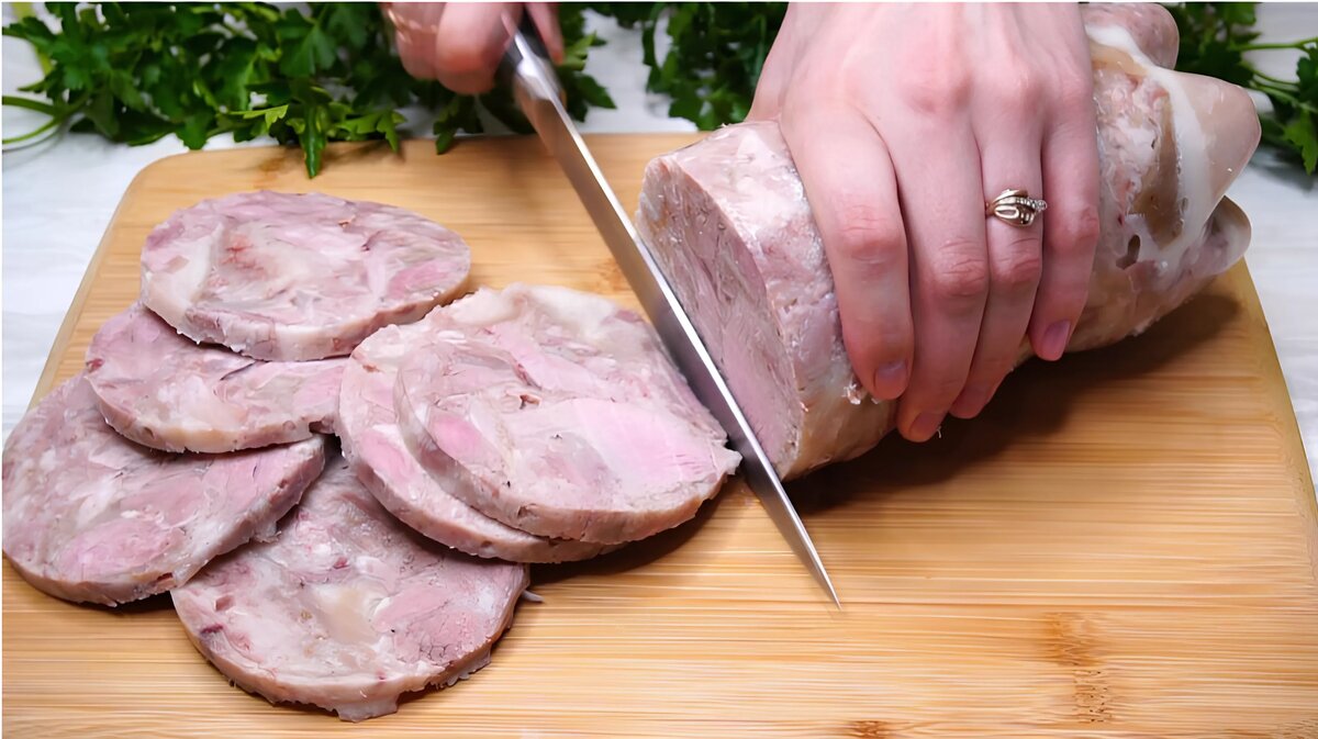 К утру зельц застывает и приобретает идеальную для нарезки плотность. Его можно резать тонкими ломтиками — он отлично держит форму и имеет насыщенный мясной вкус. Такой домашний деликатес обходится гораздо дешевле магазинного, а по вкусу превосходит его в разы.