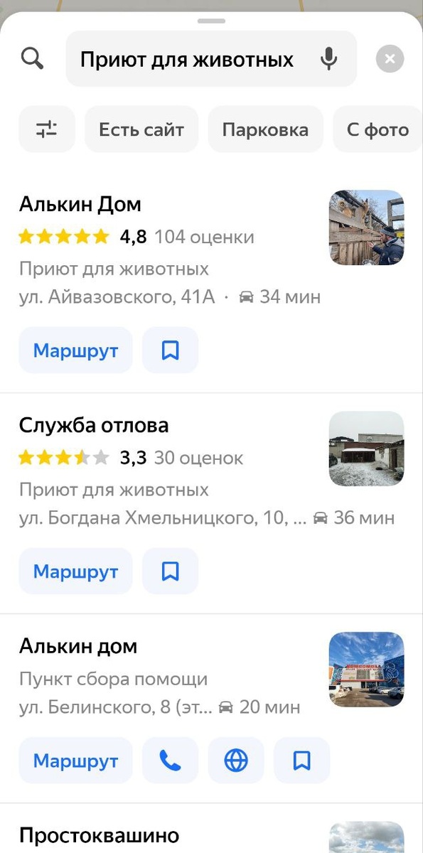 Нет адресов ни Ковчега надежды, ни Моего пса, ни Мордашек,ни Хатико, ни Верности, ни Белого клыка, ни Хаски, ни одного кошачьего приюта, а