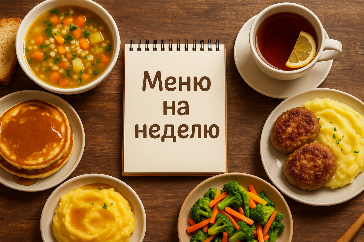 Бывает, жизнь вносит коррективы — вот и у нас недавно так вышло. Жена простыла, а я остался «у плиты». Чтобы не метаться каждый день в панике, сел и составил простое, но сытное меню на неделю. Делюсь — может, и вам пригодится! Завтрак: Овсяноблин с творожным сыром Ингредиенты: Обед: Суп с перловкой Ингредиенты: Ужин: Заливной пирог с яйцом и зелёным луком Тесто: Завтрак: Тортилья с сосисками и овощами Ингредиенты: Обед: Лапша Рамен с морским коктейлем Ингредиенты: Ужин: Котлеты говяжьи с рисом Котлеты: Завтрак: Шоколадные блины Ингредиенты: Обед: Ленивые голубцы Ингредиенты: Ужин: Гречка с овощами и котлетами из индейки Каша: Завтрак: Яичница с овощами Ингредиенты: Обед: Гороховый суп + слоёные бутерброды Суп: Ужин: Картофельное пюре + индейка в духовке Пюре: Завтрак: Пшённая каша на молоке Обед: Куриный борщ + рубленные котлеты Ужин: Омлет с замороженными овощами Завтрак: Сдобный хлеб с творогом и орехами + овсянка Обед: Рис, гречка, горох + рыба и салат Ужин: Тефтели с рисом и овощам