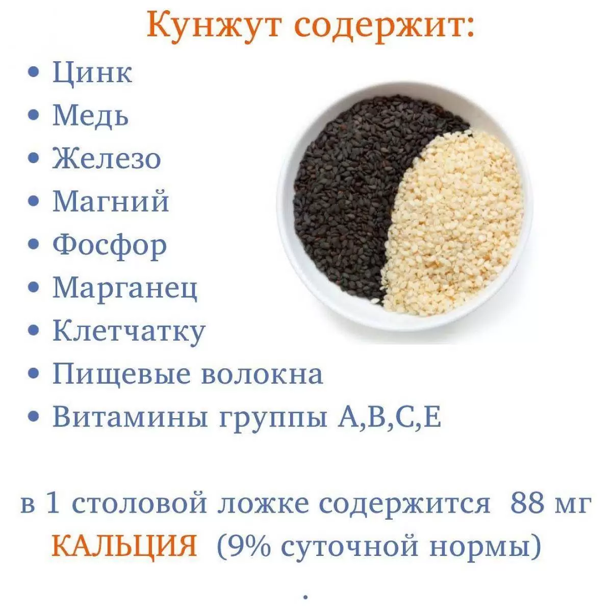 - Минералы: Кунжут – отличный источник кальция, магния, железа, цинка, фосфора и марганца.
