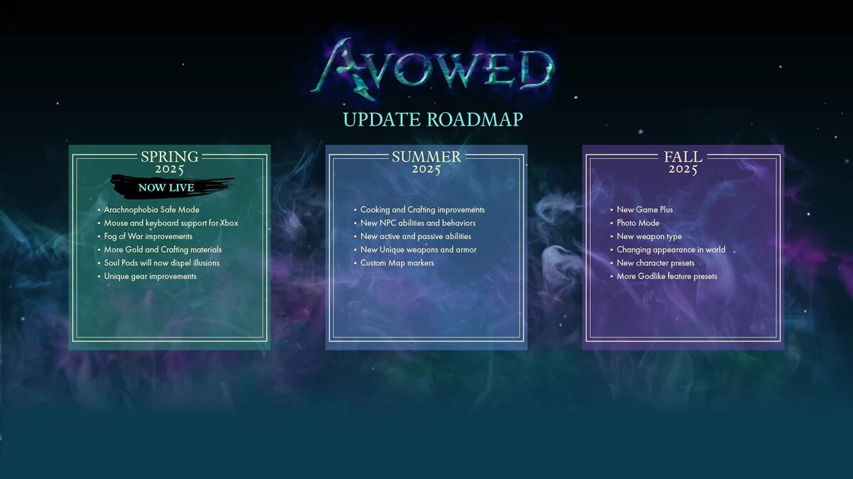 Obsidian представила дорожную карту Avowed на 2025 год, включающую три крупных обновления до конца года. Первое из них, патч 1.4, уже доступно. К концу 2025 года Avowed получит режим «Новая игра+», фоторежим, новые способности и поведение NPC, дополнительные пресеты персонажей, богоподобные черты, новое оружие и возможность изменять внешность в игровом мире. Эти нововведения появятся в летнем и осеннем обновлениях. Обновление Spring 2025 (патч 1.4), уже вышедшее, добавляет режим для арахнофобов, поддержку мыши и клавиатуры для Xbox, улучшенный туман войны, увеличенное количество золота и материалов для крафта, а также множество исправлений ошибок и мелких доработок. Подробности доступны по ссылке.