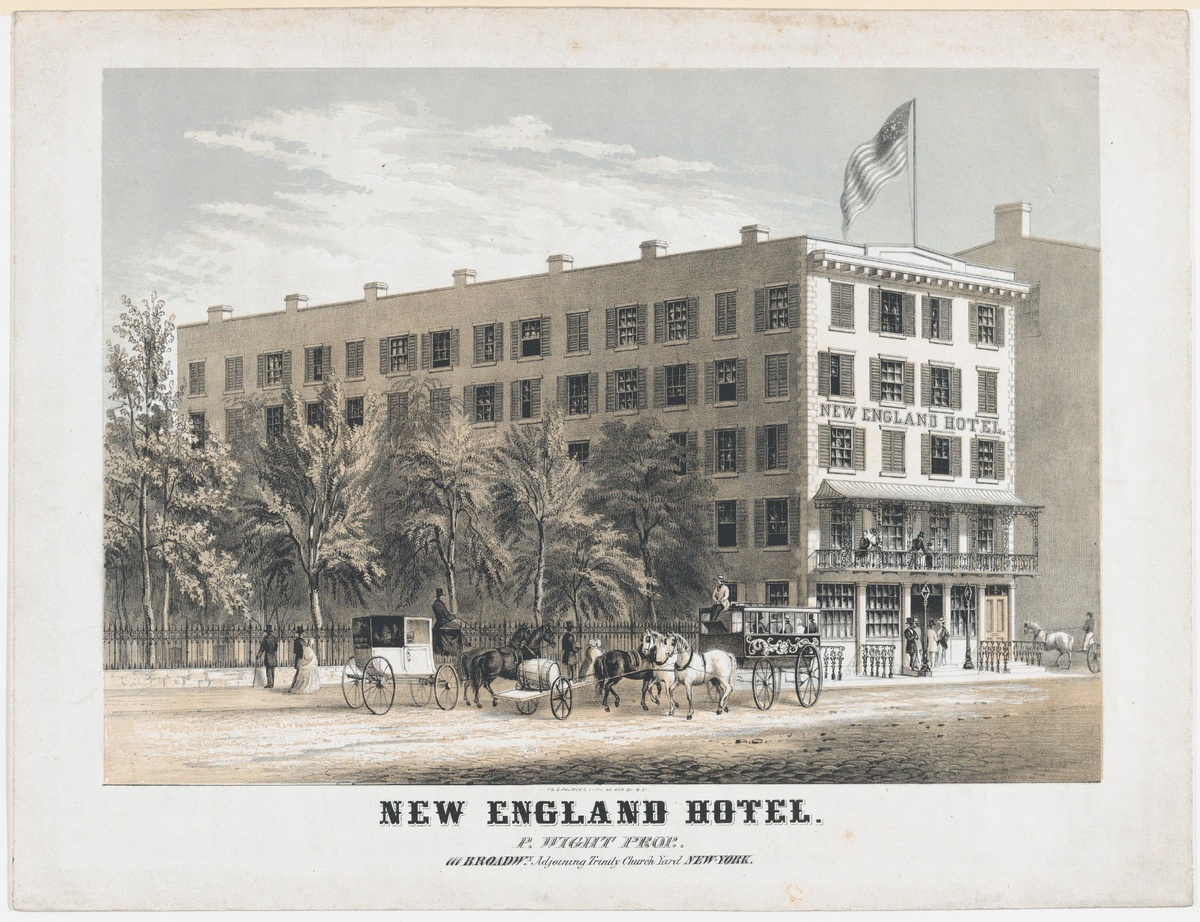 На литографии Фрэнсиса Флоры Бонда Палмера запечатлён не просто отель, но настоящий символ своей эпохи. Сложное переплетение архитектурных стилей и динамика городской жизни создают магию, которая переносит нас в Нью-Йорк середины XIX века. Мягкие оттенки и тончайшие детали передают атмосферу надежды и процветания, а рядом величественная Тринити-церковь как свидетельница времени.