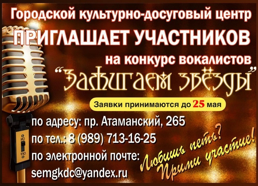 Дорогие друзья! Городской культурно-досуговый центр приглашает всех желающих в возрасте от 17 лет и старше, имеющих хорошие вокальные данные, принять участие в конкурсе дуэтов «Зажигаем звезды». Заявки принимаются до 25 мая по телефонам 8 989 713 16 25, 4-03-73 (Елена Леонидовна Шарикалова). Раскройте себя! Добавьте в жизнь ярких эмоций! А. РЫЖЕНКО, директор ГКДЦ.