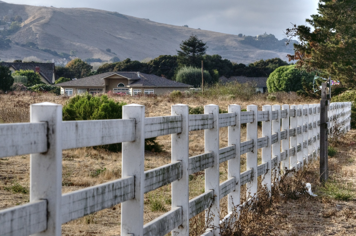 Самым распространённым забором в США является забор в стиле ранчо: это когда в столбах делаются три отверстия, в которые засовываются три трубы, палки, доски или жердины... без разницы, главное помощнее и подлиннее.