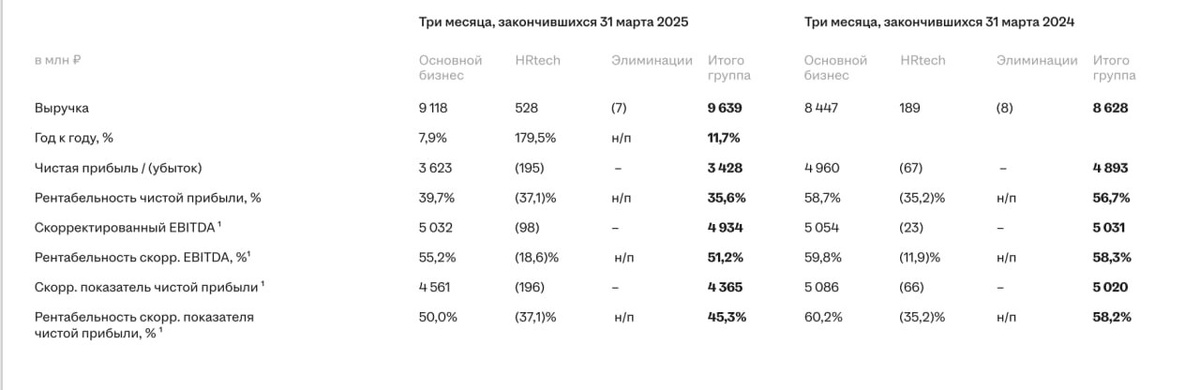 🤑Хэдхантер отчитался за первый квартал 2025 года. Прибыль снизилась, но выручка выросла. 🚀Выручка компании за первый квартал 2025 года увеличилась на 11,7% по сравнению с тем же периодом 2024 года. Основной рост обеспечила средняя выручка на клиента (ARPC). Выручка основного бизнеса выросла на 7,9% благодаря увеличению ARPC. 📌Доходы сегмента HRtech выросли на 179,5% год к году и достигли 528 млн рублей. Из этой суммы 257 млн рублей пришлись на неорганический прирост от консолидации HRlink. 📌Анализируя ключевые показатели, компания ожидает, что выручка в 2025 году вырастет на 8–12% по сравнению с предыдущим годом. Рост будет неравномерным: во втором квартале он замедлится, а в третьем — ускорится из-за сравнительной базы и календарного эффекта. ❗️С 2025 года компания планирует выплачивать дивиденды дважды в год. Промежуточные выплаты за первое полугодие могут составить 200 рублей на акцию, что даст около 7% доходности к текущим ценам. не иир