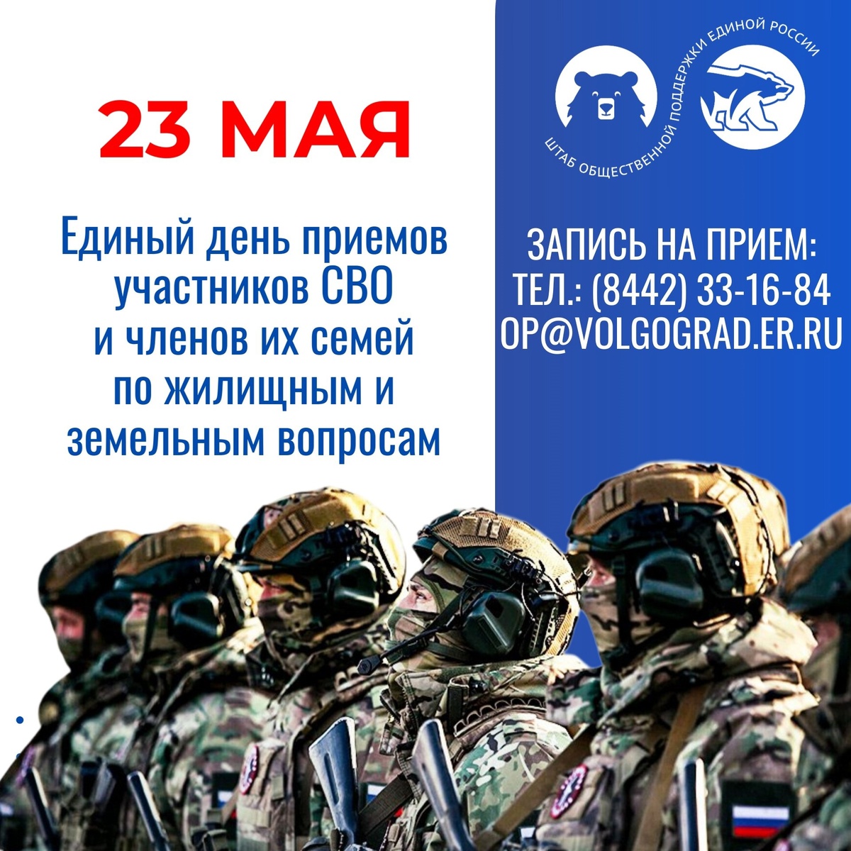 🇷🇺 23 мая «Единая Россия» проведет Единый день приемов участников СВО и членов их семей по жилищным и земельным вопросам на площадках партии в Волгоградской области. Возможные формы проведения: 🔹личные встречи; 🔹«горячие линии». ❗️Записаться на приём: тел.: (8442) 33-16-84 эл. почта: op@volgograd.er.ru