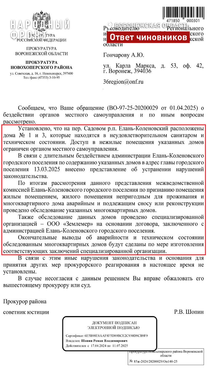 Главе администрации поселка внесли представление об устранении нарушений. После этого муниципалитет обследовал здания на предмет аварийности. Также обследование по договору с администрацией Елань-Коленовского провела специализированная организация. Окончательные выводы о техническом состоянии будут позже. Ранее Народный фронт обнаружил в переулке Садовом поселка Елань-Коленовский два заброшенных жилых дома. Окна выбиты, стены, перекрытия и лестничные пролеты рушатся. Опасные здания облюбовали для игр местные подростки. Мы попросили прокуратуру дать правовую оценку бездействию властей. Народный фронт продолжает держать ситуацию на контроле.
