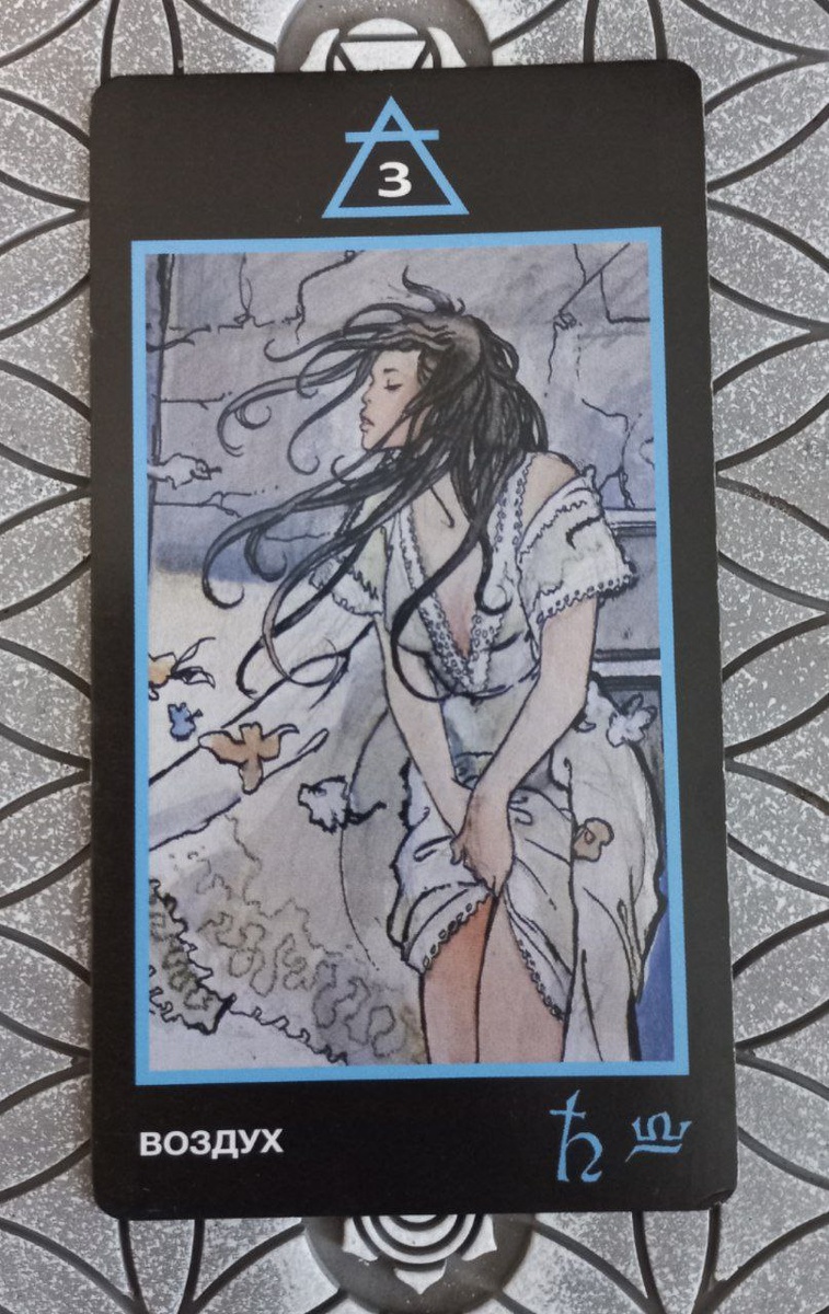 16.05.2025. Карта дня из колоды карт Манара. 3-Ка Воздуха. Стихия Воздух - это всегда про психоэмоциональное состояние человека. Про поступающую информацию, Про скорость этой информации, Про усвоение и понимание информации. Разбитые мечты. Глубокая обида, слёзы. Борьба сознания с чувствами. Состояние дискомфорта. Человек будто бы не на своём месте, он сосредоточен на своём состоянии, замкнут, не пускает окружающих людей в свой мир, в душу. Хочет изолироваться от общества. Спрятаться. Уйти. 🌛🌚🌜
