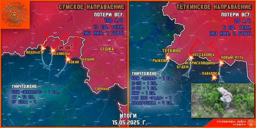 Группировка войск «Север» ВС РФ отражает попытки противника прорваться через границу Курской области на Теткинском и Глушковском направлениях, а также расширяет полосу безопасности в соседней Сумской области Украины. Северяне рассказали о текущей обстановке на линии боестолкновений в приграничье. Командование ВСУ бросает на убой новые штурмовые группы, не оставляя попыток прорыва на территорию Курской области, хотя и осознает, что они будут уничтожены еще на подступах к госгранице. Российская разведка утром 15 мая вскрыла выдвижение очередной украинской инженерной машины разминирования из окрестностей села Атинское Сумской области. ИМР ликвидирована FPV-дронами. Там же вскрыта группа ВСУ на мобильной технике, ее большая часть уничтожена, остатки бежали вглубь Сумской области. На направлении Рыжевка — Теткино противник пытался пробраться на южные окраины приграничного поселка Теткино Глушковского района. Пересечения госграницы не допущено. Уничтожены и штурмовики ВСУ, которых перебрасыв