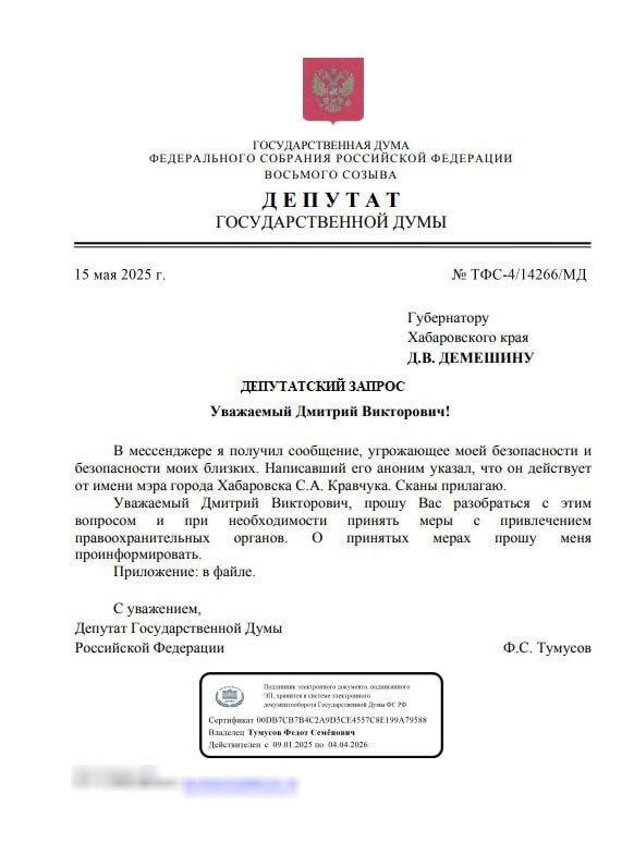 Депутат Госдумы от партии «Справедливая Россия - За правду» Федот Тумусов заявил об угрозе в свой адрес. Парламентарий в апреле раскритиковал мэрию Хабаровска за неубранный снег и грязные кучи по всему городу. После этого неизвестный написал ему в telegram и предложил прекратить информационную кампанию против администрации. - После того как я опубликовал в социальных сетях информацию с критикой деятельности мэра Хабаровска С.А. Кравчука (по поводу предоставления квартир мигрантам, неуборки снега в городе и по другим вопросам), мне стали поступать сообщения угрожающего характера. И по этому конкретному факту я обращаюсь к губернатору Хабаровского края. Надеюсь, как силовик он примет меры с тем, чтобы привести в чувство зарвавшихся чиновников, - указал Федот Тумусов. Он также опубликовал переписку с неизвестным человеком, который представился посланником от мэра Хабаровска Сергея Кравчука, но никаких доказательств этому не представил. Он также заявил, что «зарыть топор войны» необходимо,
