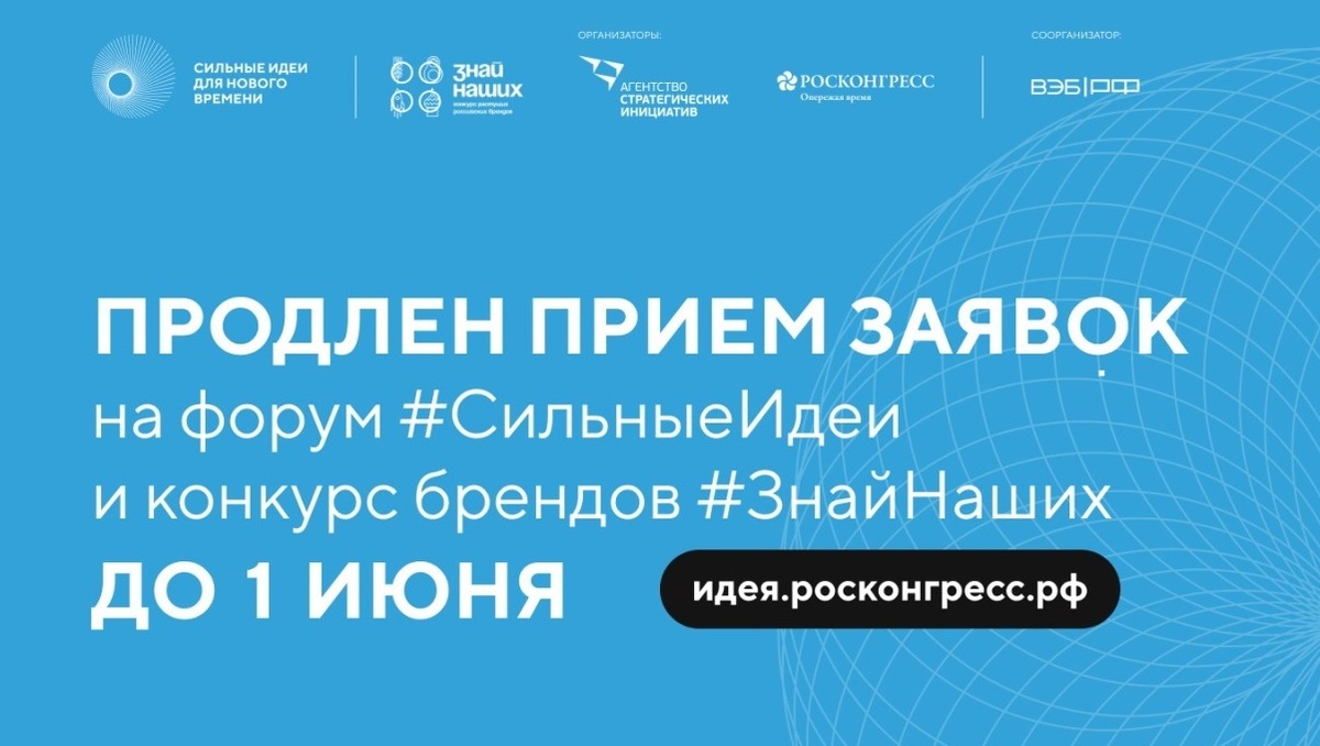 Конкурс отечественных брендов продлил прием заявок до 1 июня включительно. Подать свою идею можно на крауд-платформе идея.росконгресс.рф или заявить о своем бренде на знайнаших.аси.рф. Организаторы — АСИ и фонд Росконгресс, соорганизатор — ВЭБ.РФ. Цель форума — выявить и поддержать перспективные проекты и инициативы, способствующие комплексному развитию России через пять ключевых направлений: «Форум „Сильные идеи для нового времени“ и конкурс отечественных брендов вызывают значительный интерес у аудитории. По многочисленным просьбам участников мы продлеваем сроки приёма заявок до 1 июня. Это даст возможность более тщательно подготовить проекты. Лучшие решения планируем внедрить для улучшения качества жизни людей», — заявил глава организационного комитета форума — заместитель руководителя администрации президента РФ Максим Орешкин. После подачи идей эксперты проверяют и оценивают все поступившие на форум заявки, а также дают свои комментарии для доработки проектов. Кроме того, до начала