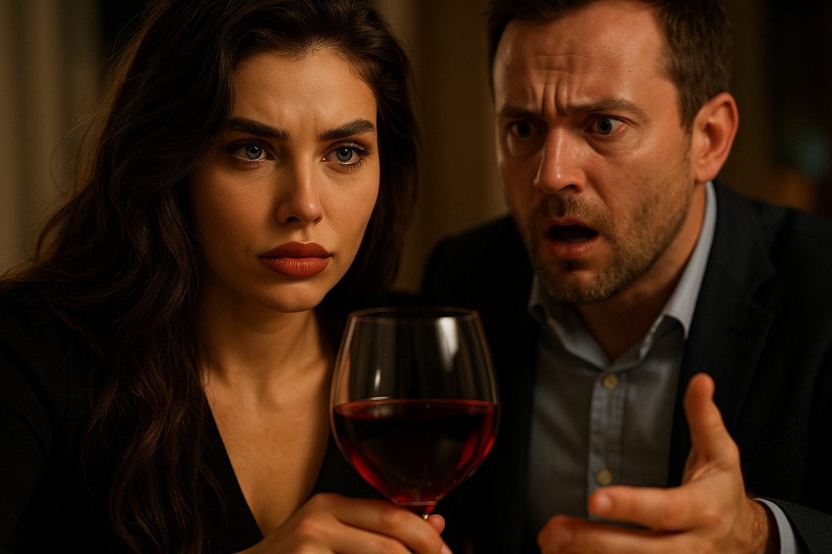 Стеклянный бокал с красным вином замер в воздухе. Сергей медленно опустил его на стол, не донеся до рта. Капля вина упала на белоснежную скатерть, расплываясь алым пятном, как кровь на снегу.