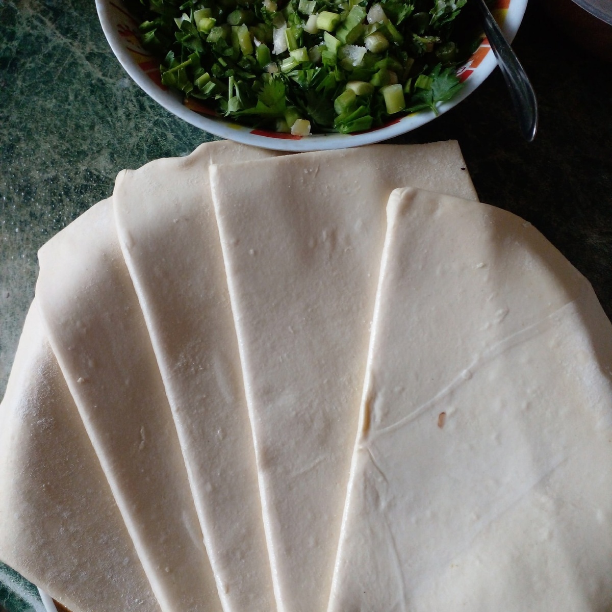 Тесто порезать на квадраты по своему усмотрению. И раскатать скалкой.