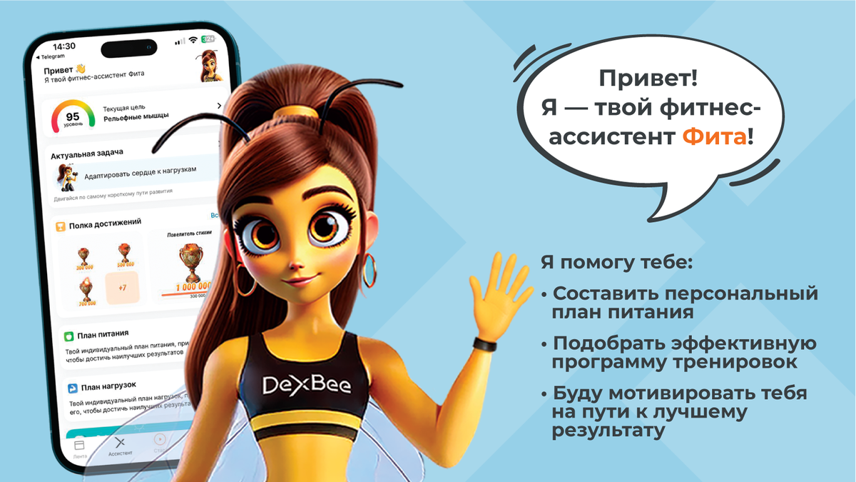 - Как мотивировать клиентов возвращаться в зал, удерживать их интерес и строить долгосрочные отношения с помощью современных технологий - О Фите — интеллектуальном помощнике в системе DexBee, который обеспечит клубам укрепление связи с клиентами и усилит бизнес-результаты Фита — это интеллектуальный фитнес-ассистент, встроенный в цифровую систему управления клубом DexBee. Она меняет подход к тренировкам, делая его более осознанным. Фита помогает клиенту поставить цели, придерживаться плана и видеть реальный прогресс. Её ключевая задача — повышать мотивацию и поддерживать клиента на пути к результату, вовлекая в тренировочный процесс. Фитнес-ассистент Фита - это надёжное связующее звено между клиентом и клубом, которое повысит лояльность и продлит «жизнь» клиента в клубной системе. Фита выстраивает индивидуальное взаимодействие с каждым клиентом, предлагая персонализированный цифровой опыт: ✔️ Определение цели Помогает пользователю осознанно сформулировать, зачем он пришёл в зал — буд