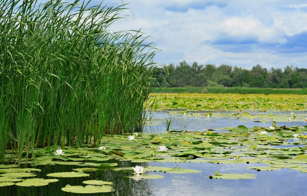 Вода здесь стоит почти неподвижно, поверхность её покрыта ковром водной растительности. Трава местами образует непроходимые заросли, перемежающиеся с небольшими, более чистыми участками, где сквозь прозрачную воду просматривается дно.