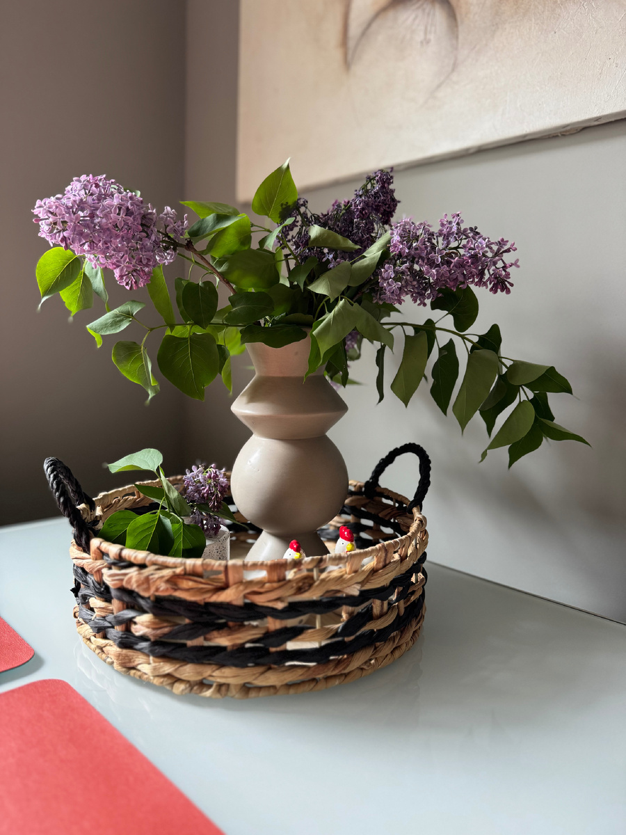 Нашла его в Фамилии. Идеально вписался в гостиной. Как раз есть черные элементы и натуральный цвет плетения) Ваза была куплена за 119р в Фамилии у метро Коньково.