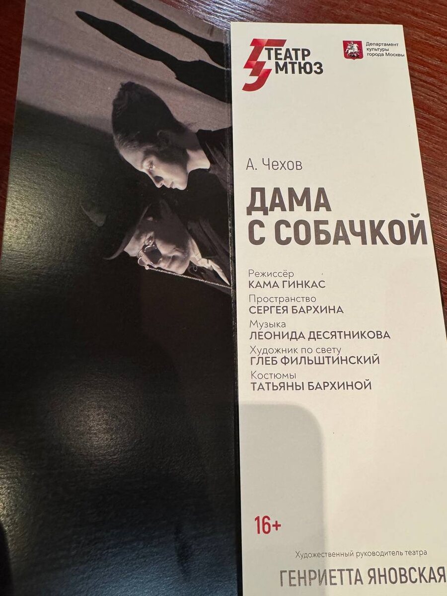 ДАМА С СОБАЧКОЙ МТЮЗ РЕЖИССЕР КАМА ГИНКАС В ГЛАВНОЙ РОЛИ ИГОРЬ ГОРДИН Продолжительность: 2 часа без антракта Спектакль играется на 3 этаже театра, там где балкон, это очень необычно оригинально, прекрасные декорации, соответсвующие плавному течению спектакля, органичные музыкальные вставки. "Дама с собачкой" – безусловно, яркое событие театрального сезона. Удивительно, что постановка, идущая на сцене более двух десятилетий, не только не утратила своей актуальности, но и сохранила свою первозданную глубину и мастерство. Это зрелище, которое нельзя пропустить, ведь в нём раскрывается истинный Чехов благодаря режиссерскому видению Гинкаса. В спектакле присутствует сам Антон Павлович: в начале среди отдыхающих можно заметить знакомые черты – бородку и пенсне. Ближе к финалу актёр Гордин, исполняющий роль Гурина, надевает пенсне, на мгновение преображаясь в Чехова. Подобно Чехову, умевшему видеть драму в обыденности, Гинкас превращает окружающее пространство в театральную сцену. Он испол