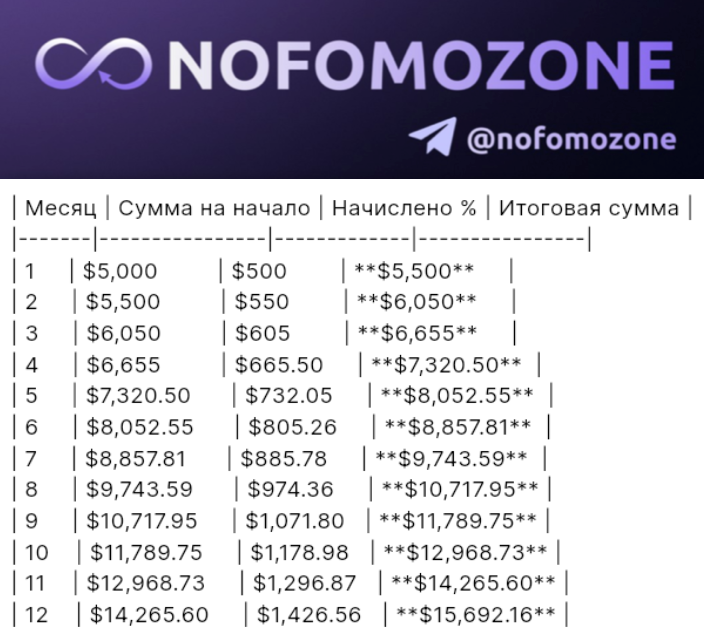 💰Инвестируйте просто с нашим алгоритмом, случай когда деньги делают деньги. Возьмем за основу самый консервативный в нашем случае показатель в 10%, хотя такие % принято считать сверх высокими даже в рамках крипторынка. Расчет вклада с использованием сложного процента 👌🔥 💰 Сумасшедший рост: что будет с $5000 при 10% в месяц с реинвестированием? Исходные данные: ▫ Начальная сумма: $5,000 ▫ Доходность: 10% в месяц ▫ Срок: 12 месяцев ▫ Режим: ежемесячная капитализация 💥 Итоговые результаты: ▫ Начальные инвестиции: $5,000 ▫ Общий доход: $10,692.16 ▫ Итоговая сумма: $15,692.16 🔮 Магия сложных процентов: Ваши деньги растут как снежный ком! ✔ Через 6 месяцев: +77% ✔ Через 12 месяцев: +213% P/s-Мы сделали алгоритм еще надежнее, но об этом чуть позже 🎯 👉 [Подключить Nofomozone https://t.me/nofomozone/880] (это проще, чем объяснить тёще, чем ты занимаешься) 👉 Регистрация на бирже Bybit https://partner.bybit.com/b/NOFOMOZONE] Любые вопросы в нашем телеграмм канале @nofomozone