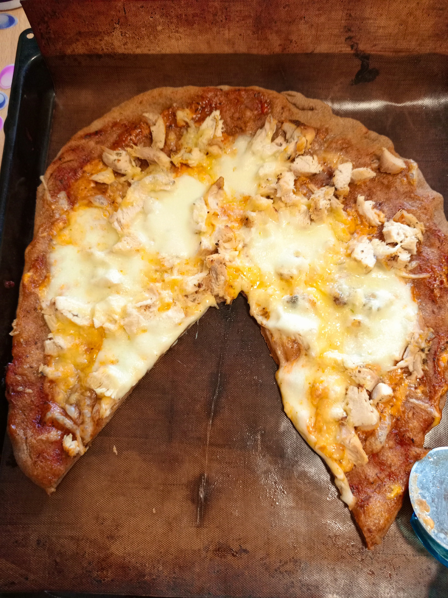 Для приготовления пиццы понадобятся следующие продукты: Мука цельнозерновая пшеничная 400 г. Вода 300 мл. Дрожжи 5 г. Растительное масло 20 г. Соль Майонез 20 г. Кетчуп 30 г. Куриная грудка 100 г. Сыр Гауда 100 г. Сыр моцарелла 100 г. В муку добавляем воду, дрожжи, соль. Размешиваем и оставляем для расстойки на 30 минут. Затем берем половину теста. Для одной пиццы диаметром 30 см. понадобится только половина теста. Расскатываем круг диаметром 30 см. Смазываем кетчупом, майонезом. Выкладываем кусочки куриной грудки. Посыпаем сыром. Ставим в хорошо разогретую духовку на 15 минут. Температура 200 градусов. Приятного аппетита.