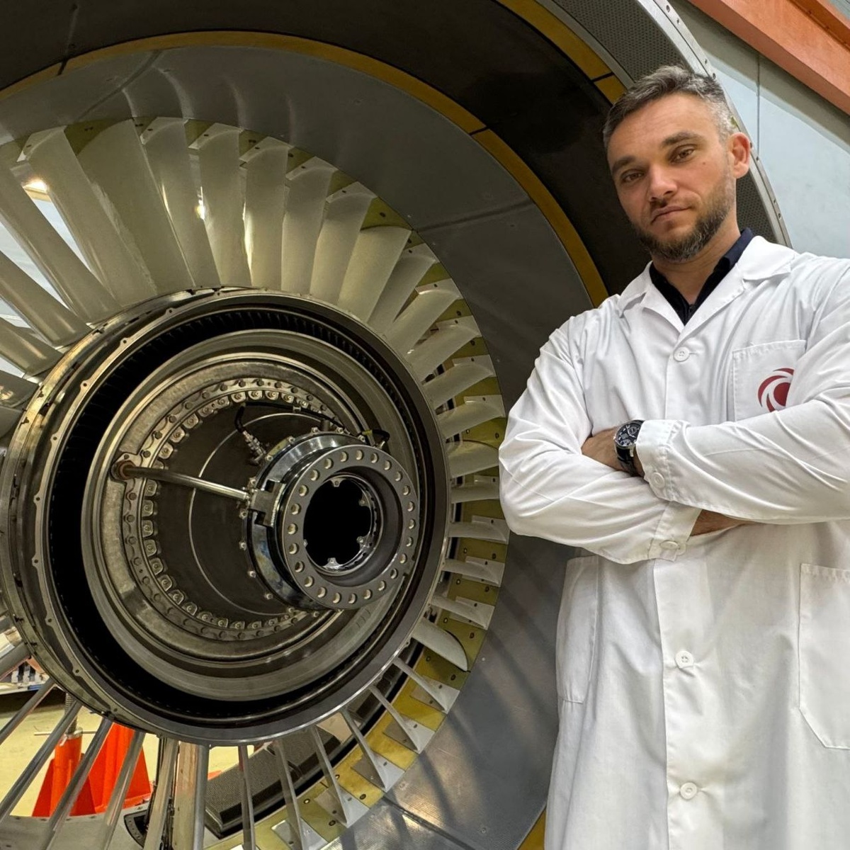 - на фоне нового авидвигателя ПД-14 для нового российского самолета МС-21-310 телеведущий "Россия 24" Антон Борисов (@borisovantontv).