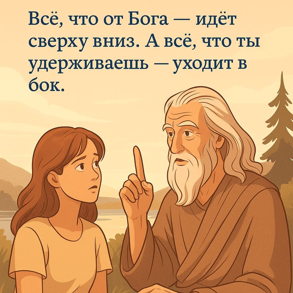 Когда я только приехала к Ай, меня не покидало ощущение... будто я что-то упустила. Что-то важное. Я жила, как все — заботы, дела, эмоции, стремления. Но словно по кругу. В тот день мы сидели на поляне. Над водой гулял ветер, и солнце перебирало лучами сосновые ветки. Ай молчал. Я тоже молчала. И вдруг сама собой вырвалась фраза: — Ай... А почему у меня ощущение, что всё вроде правильно, а внутри — пусто? Как будто я что-то делаю не в ту сторону? Он посмотрел на меня ласково, как отец на дочь, которая впервые задаёт взрослый вопрос. — Потому что ты всё делаешь вбок. — сказал он. — А нужно вглубь. Ты живёшь в горизонтали. А счастье живёт в вертикали. Я нахмурилась, не понимая. — Представь жизнь как ткань, — продолжал он. — В ней сотканы разные нити: здоровье, отношения, работа, вдохновение... Но большинство людей ткут только в одну сторону — по поверхности. Они хотят удержать формы. А жизнь приходит в полноту, когда ты соединяешь эту ткань сверху вниз. С Истоком. Когда каждая сфера жизн