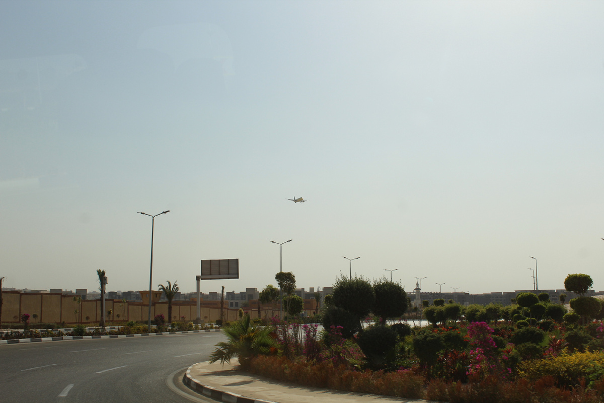Выезжаем из аэропорта. Фото по пути из окна машины. Около аэропорта зелено. В городах тоже зелено. Проезжаем Нил. Проезжаем Гизу. Видны пирамиды в Гизе. Мы будем там на экскурсии. Что это такое? Гид сказал, что это голубятни. В Египте едят голубей. Проезжаем сахарный завод. Солнце садится. Приехали в Александрию в отель "Sunrise Alex Avenue Hotel" примерно в 20-30.