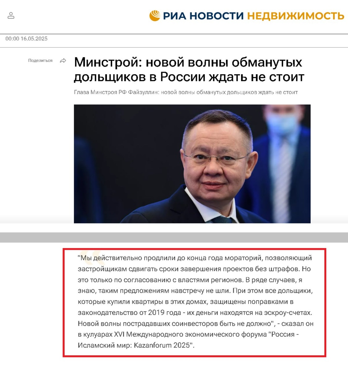 Много ли можно настроить, когда у виска пистолет. Поразительное интервью главы Минстроя г-на Файзуллина. «Новой волны обманутых дольщиков в России ждать не стоит». Но фото он улыбается, но в словах сталь. Чтобы поняли, начну с концовки (цитата): ,,, «Все запущенные жилые проекты находятся под строгим контролем и мониторингом соответствующих органов как на федеральном, так и на региональном уровнях, в том числе и у правоохранительных органов». ... Либо эти самые органы должны принимать в штат прорабов, либо приставлять сотрудника с кобурой к любому директору, следить за каждой его подписью. Зачем органам «мониторить» стройки. Это скорее по линии коррупции, а не по линии предотвращения остановки строек. Каждый должен заниматься своим делом, не? Но бомба в другом (цитата): ,,, "Мы действительно продлили до конца года мораторий, позволяющий застройщикам сдвигать сроки завершения проектов без штрафов. Но это только по согласованию с властями регионов. В ряде случаев, я знаю, таким предложе