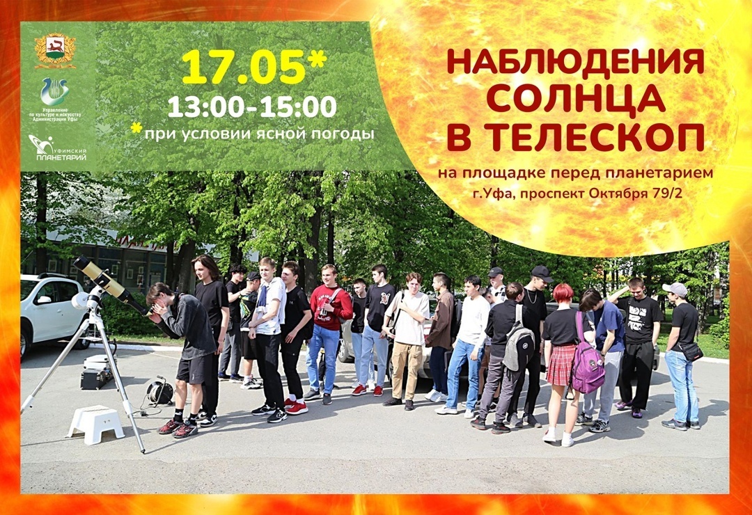 17 мая с 13.00 до 15.00 часов на площадке перед Уфимским городским планетарием (проспект Октября, 79/2) состоится наблюдение Солнца в телескоп. Бесплатная акция пройдет при условии ясной погоды. Все желающие смогут задать вопросы и узнать больше интересных фактов о нашей самой главной Звезде, рассказали в планетарии.