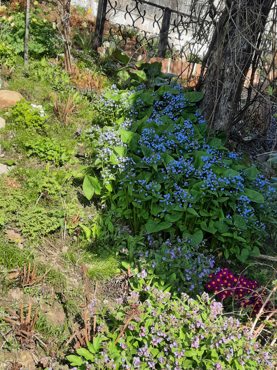 Вот это вредное растение я терплю за эту весеннюю красоту! Сокращаю, убавляю, раздаю, но большую часть куртины оставляю, чтобы в мае увидеть огромные голубые незабудки бруннеры сибирской. Потом она "уляжется" на землю, папоротники спрячут эту неприглядную картинку. А я буду ждать новую весну.