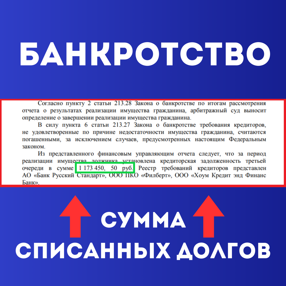 Зафиналим рабочую неделю на еще одном положительном моменте. Наша клиентка Бакыт Дюсенбаевна в этот понедельник получила судебное решение, которое ее очень обрадовало👇 Процедура банкротство физических лиц официально завершена, списание долгов прошло успешно! Поздравляем клиента и благодарим юристов Андрея и Вячеслава за отличную работу! А теперь несколько деталей по процедуре: ✅У клиентки были задолженности по двум кредитам в "Русском Стандарте", "Хоум кредите" и одна задолженность, проданная коллекторскому агентству ✅Общая сумма задолженности составила 1 173 450, 50 руб. ✅Наши юристы добились отказа от взаимодействия с банками и коллекторами, чтобы во время процедуры никто не беспокоил нашего клиента ✅Собрали необходимые справки и документы, составили документы в Арбитражный суд и по доверенности представили интересы клиента на судебных заседаниях ✅Благодаря слаженной и грамотной работе наших специалистов была списана не только сумма основного долга, но и пени, проценты и неустойки!