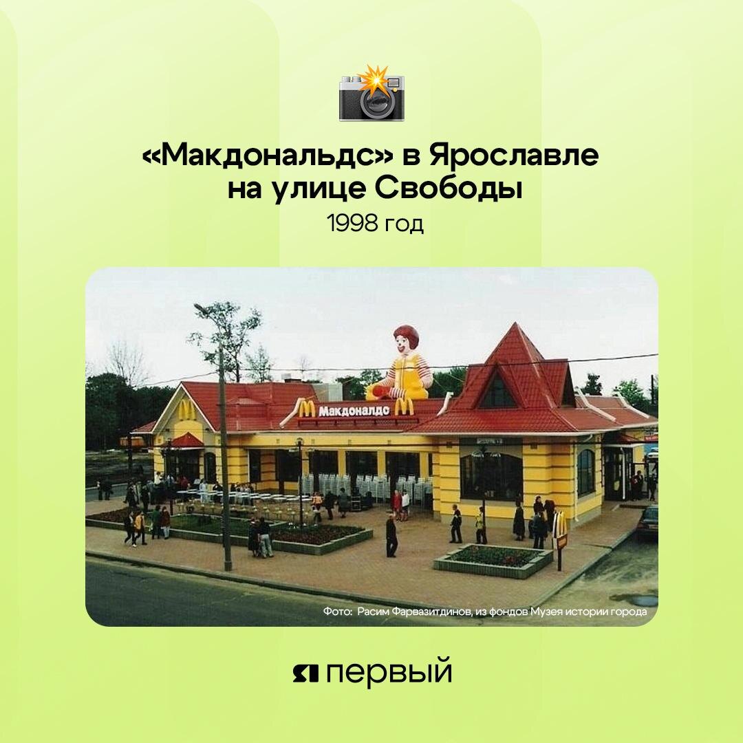 #ЯПервый_ретро 🤡 Гигантский клоун на крыше общепита. Вы ещё помните его? Раньше вымышленный персонаж Рональд Макдональд находился именно здесь. А ещё одна копия, чуть поменьше, внутри сидела на лавочке. И как у нас не сформировалась коулрофобия? 😂 Первый ресторан «Макдональдс» был открыт у нас в Ярославле в 90-е годы на улице Свободы. Раньше тут отмечали дни рождения, встречались с друзьями и с удовольствием лакомились булочками с кунжутом. Делитесь фотографиями тех времён через бота @yartv76_bot 💚 Подписаться | Прислать новость