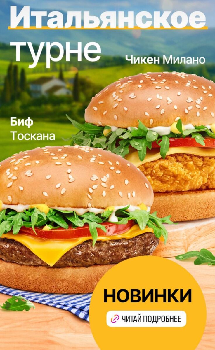 Белорусский Макдоналдс запустил итальянское турне 😱. В Италию нас, конечно, не отправят, но в меню появились итальянские бургеры и шримп ролл с креветкой, которые «перенесут в Тоскану или модный Милан».