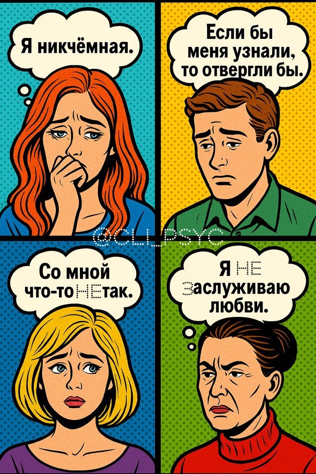 Эта схема — не про то, что человек «иногда себя не любит». Она про то, что в его внутреннем восприятии он — дефект, «бракованный», «неприемлемый», «недостойный». Он может быть сколько угодно образованным, добрым, харизматичным, социально успешным — но внутри себя он либо это не чувствует, либо всё время пытается это доказать, либо не верит ни единому слову похвалы. Это не просто убеждение — это фильтр, через который он воспринимает себя и весь опыт.