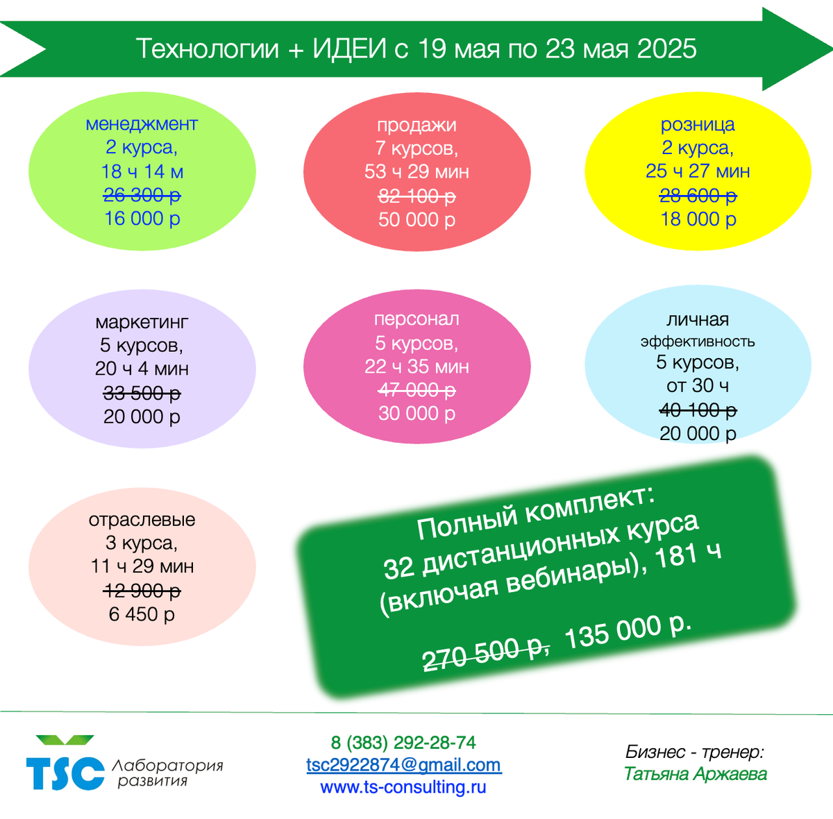 С 19 мая 2025 года по 23 мая 2025 года!!! Глубоко, системно, технологично и... конечно с идеями :), которые сейчас очень важны (именно поэтому этим летом мы делаем такие акции (это впервые) - сейчас потребность в знаниях и идеях как никогда высока). ЧТО ВХОДИТ В ОНЛАЙН - КОМПЛЕКТ? Полный комплект - вместо 270 500 руб. будет 135 000 руб. Комплекты по направлениям (можно по отдельности): менеджмент - 18 ч 14 м, вместо 26 300 руб. = 16 000 руб. Ключевые управленческие компетенции эффективного руководителя Передача ответственности. Умение делегировать продажи - 53 ч 29 м, вместо 82 100 руб. = 50 000 руб. План действий по управлению продажами: от А до Я Колл - центр: рекомендуем Новые технологии в телефонных продажах Дебиторская задолженность: предупредить и устранить мастер-класс "Мастерство продаж" Как продавать в период спада, увеличивать продажи? Где скрываются дубинки продаж? Как внедрить техники продаж с тренинга в работу? розница - 25 ч 27 м, вместо 28 600 руб. = 18 000 руб. Управле