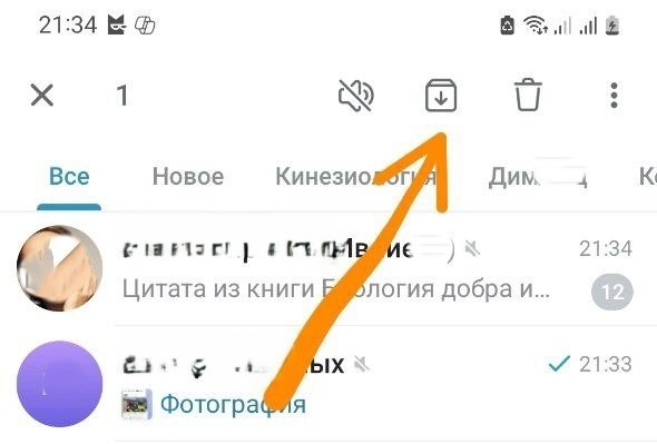 Зажмите канал на 2 секунды → иконка "Архивировать"