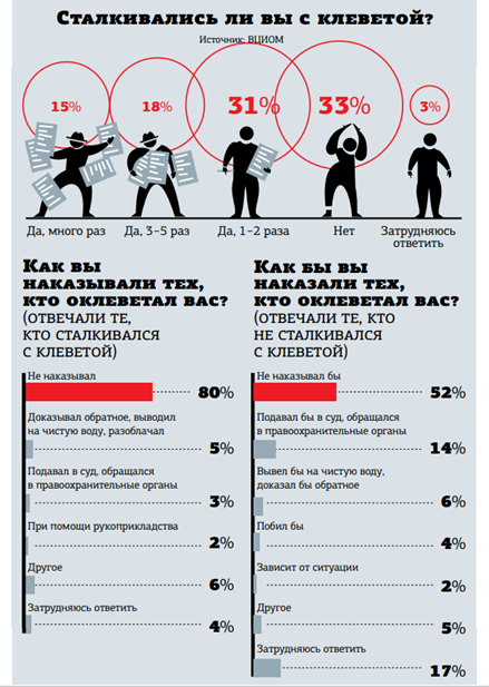 Теоретически всё это звучит неплохо. Однако предубеждение к выяснению отношений в суде у граждан России никуда не исчезло. И данные соцопроса это косвенно подтверждают. Из тех, кто с клеветой в жизни не сталкивался, 14% заявили, что в случае чего первым делом будут обращаться в суд или к правоохранителям. А вот из тех, кто имел в жизни такой печальный опыт, реально до суда или полиции дошли всего лишь 3%.
