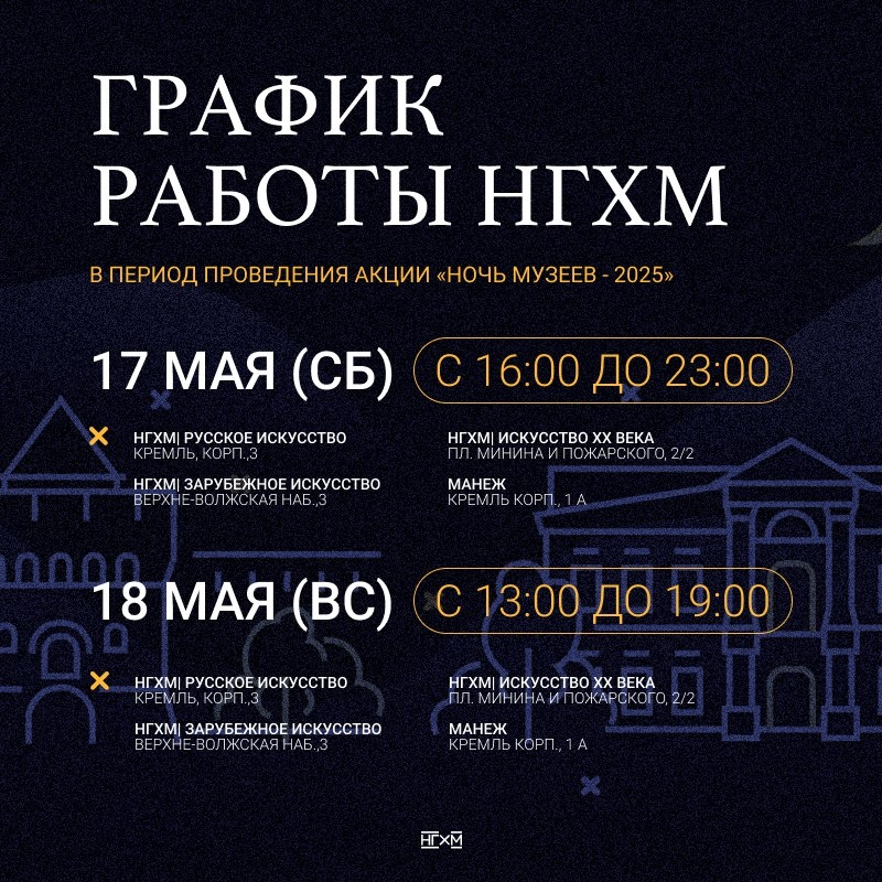 📆18 мая 2025 года все здания НГХМ работают с 13:00 до 19:00 (напоминаем, что кассы закрываются в 18:30).