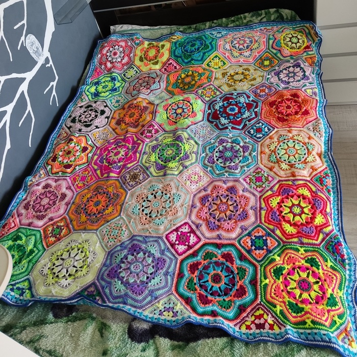 На майские закончила вязать плед. Когда-то давно увидела подобный плед в интернете со схемами элементов, с тех пор это уже второй, но он больше. Размер матраса на кровати 140 на 200. Начала я его ещё осенью 2023, вязала не регулярно с перерывами. Самое муторное это убирать нитки с обратной стороны. Вот эти все нитки я завязываю ткацким узлом и обрезаю. В этот раз заняло оооочень много времени, для себя решила, что нужно их обрезать после того как закончила очередной элемент, чтобы потом не тратить несколько дней на это. Специально сфоткала с коробком, потому что количество обрезанных ниток было огромным и это даже не всё. Потом выкладываю все элементы и выбираю раскладку. Собираю все элементы, начала большой иглой, закончила крючком. Крючком реально удобнее. Потом обвязываю по краю несколько рядов и готово. Этот плед подарю маме и скорее всего начну новый. Ну нравится мне вязать яркие элементы, яркими нитками) А это первый плед связанный пять лет назад, сейчас висит в деревне на стене,