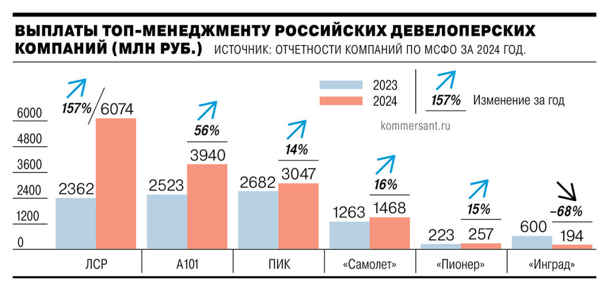 🪖 Крупные застройщики в 2024 году увеличили выплаты топ-менеджменту более чем в полтора раза — Коммерсантъ