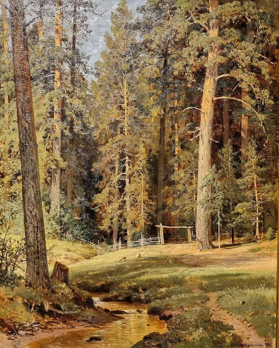 ИВАН ШИШКИН ЛЕСНАЯ ОПУШКА этюд, 1884, холст, масло Национальная картинная галерея Армении Секрет широкой популярности Шишкина был, может быть, лучше всего раскрыт в обращенных к художнику словах В. М. Васнецова: „Если дороги нам картины природы нашей дорогой и милой Руси, если мы хотим найти свои истинно народные пути к изображению ее ясного, тихого и задушевного облика, то пути эти лежат и через Ваши смолистые, полные тихой поэзии леса. Корни Ваши так глубоко и накрепко вросли в почву родного искусства, что их никем и никогда оттуда не выкорчевать“. Ирина Шувалова. «Что может быть лучше природы!» // Иван Шишкин из собраний Русского музея и Третьяковской галереи. СПб, 2008.
