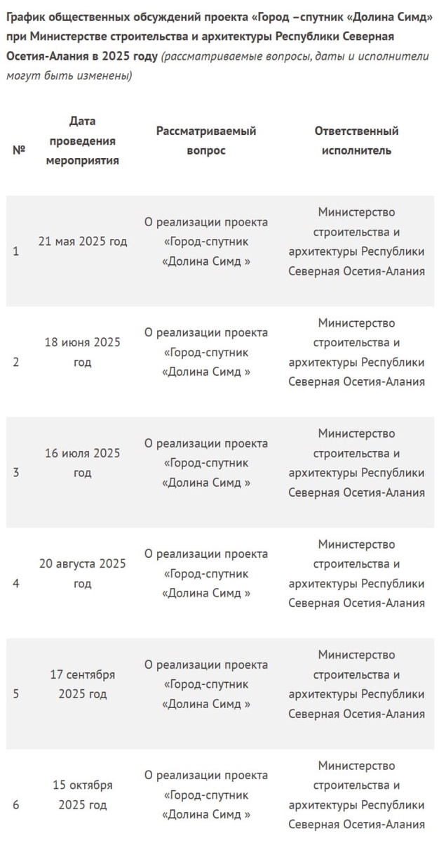 ❗️21 мая 2025 года (в следующую среду) в Министерстве строительства и архитектуры по адресу: г.Владикавказ, ул. Чкалова, д.3, состоятся Общественные обсуждения проекта строительства города-спутника «Долина Симд».